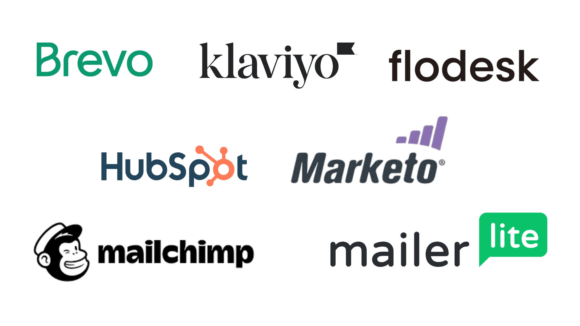 Mailchimp, Klaviyo, ActiveCampaign, HubSpot, MailerLite, Flodesk, Brevo (formerly Sendinblue), and Marketo, as well as a range of CRM and e-commerce integrations including Shopify, WooCommerce, Squarespace, and WordPress.