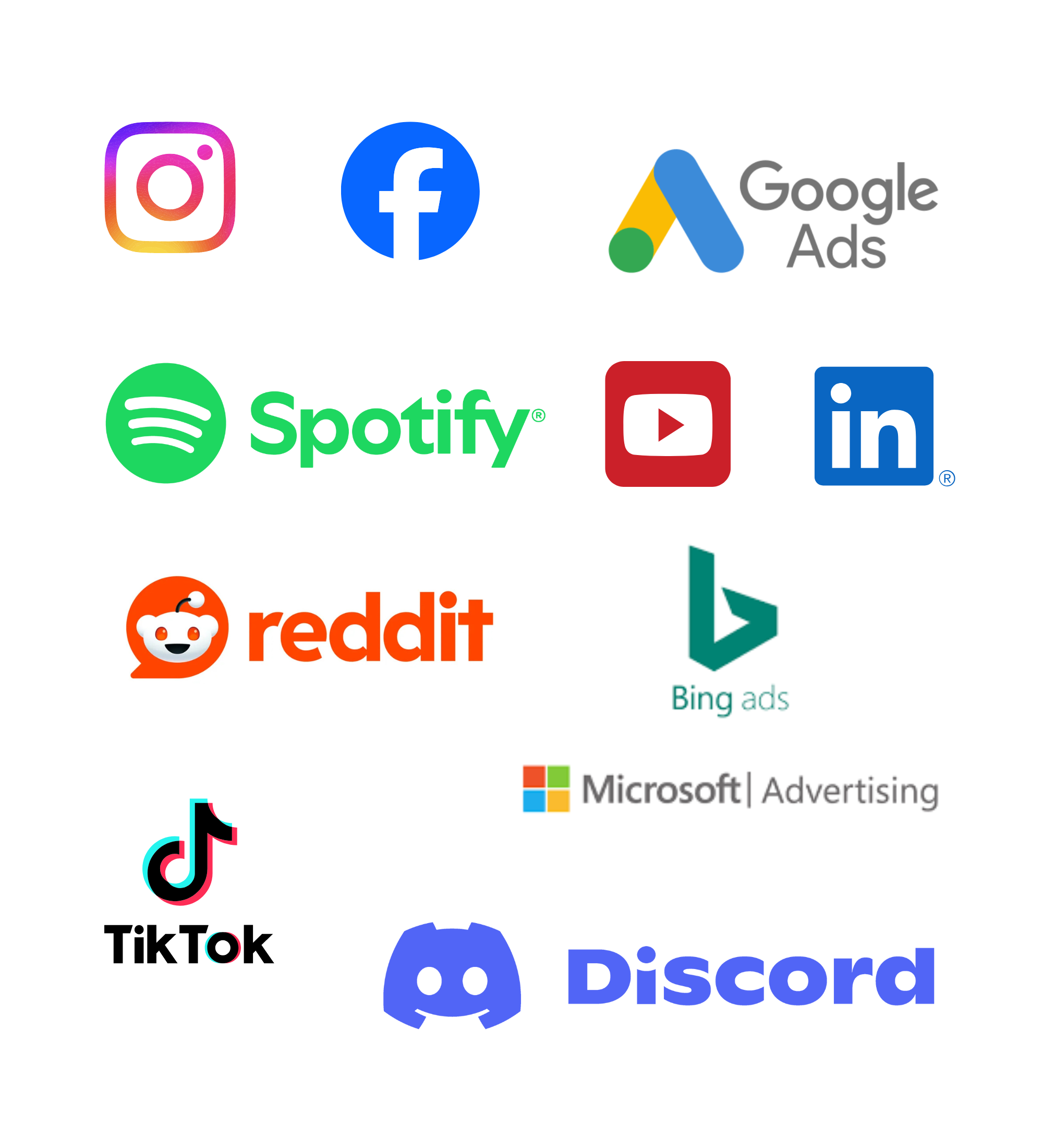 We plan, launch, and optimise smart paid ad campaigns across today’s most powerful platforms, Google, Meta (Facebook + Instagram), TikTok, Reddit, Bing (Microsoft), Spotify, and Discord, helping your brand grow faster and reach your target audience.